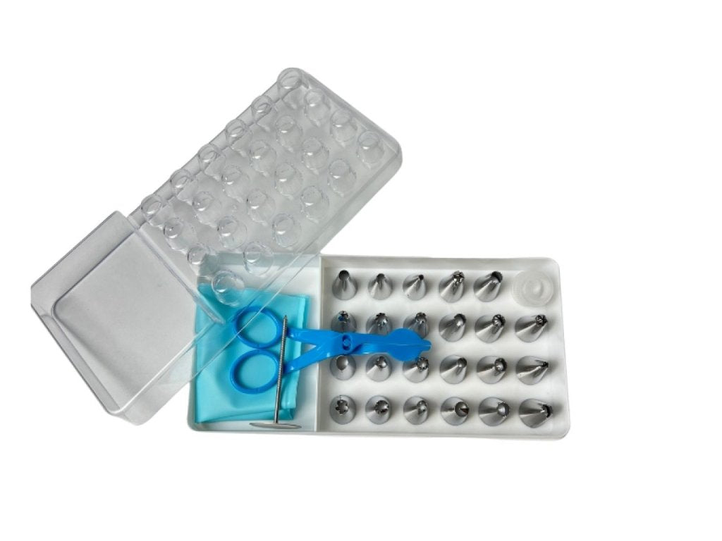 Kompletní cukrářská sada pro zdobení dortů a cukroví a perníčků. Obsahuje zdobicí sáček (31×15,5 cm), 23 nerezových nástavců a plastové nůžky. Ideální pro vytváření různých dekorací; certifikováno pro styk s potravinami. Hroty z nerezové oceli zajišťují dlouhou životnost a snadné čištění.
